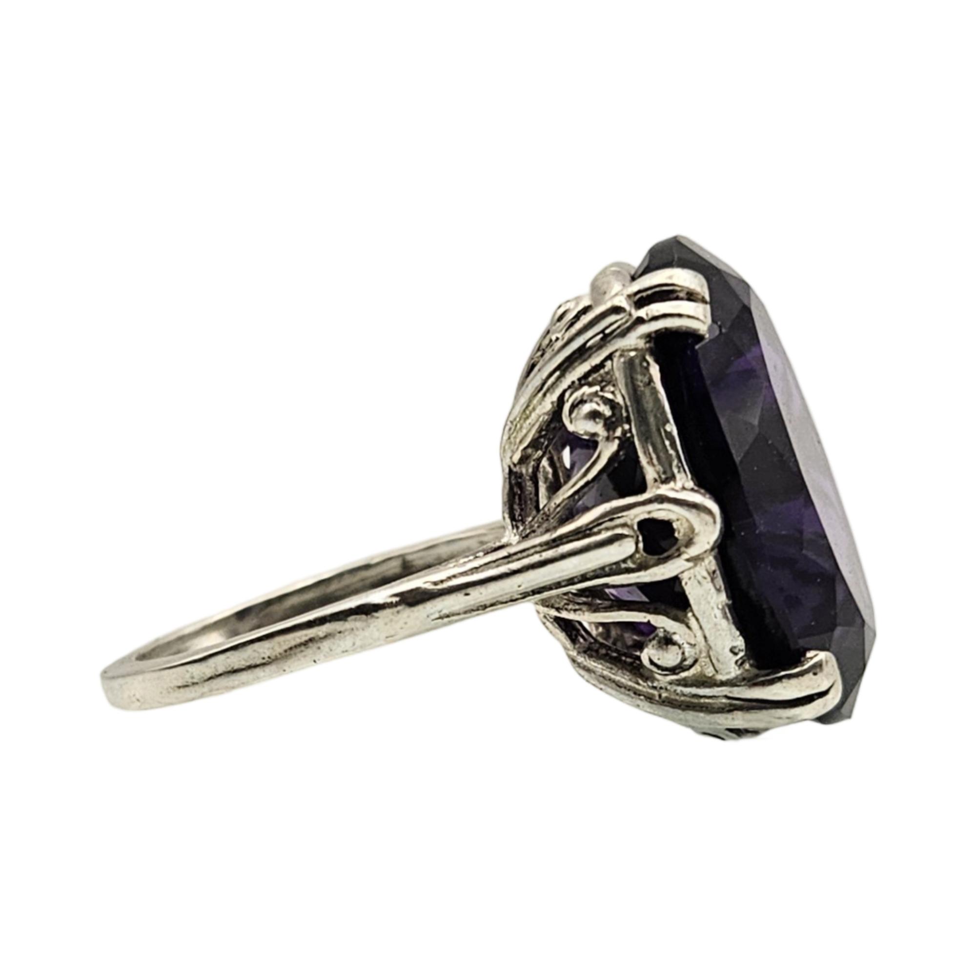 An antique style sterling silver filigree scroll work huge simulated amethyst ring. The ring is a show stopper with an 18x13mm approx. 11.00 carat oval shaped imitation amethyst with a vivid medium dark purple color. The scroll work is simple in design and sturdy enough to support the large stone which is secured in the setting with 4 strong split prongs.